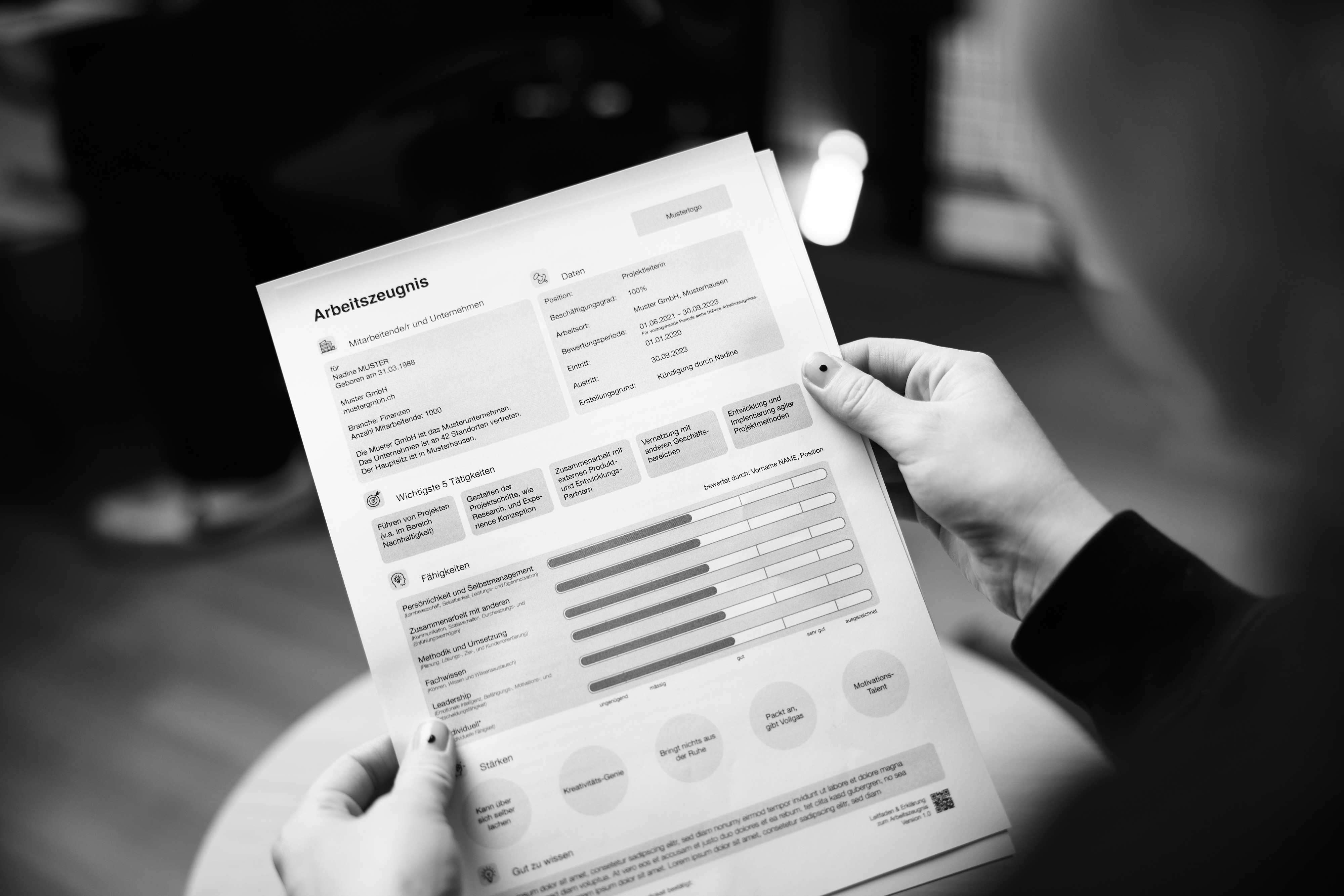 Drei Stärken sind verpflichtend, zwei weitere optional. Sie spiegeln die Persönlichkeit der bewerteten Person wider und werden individuell ausgewählt.