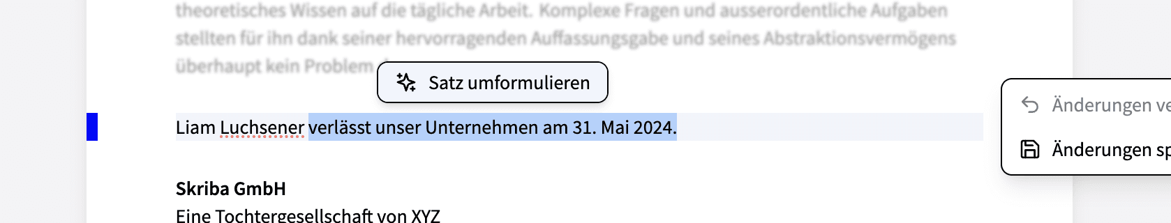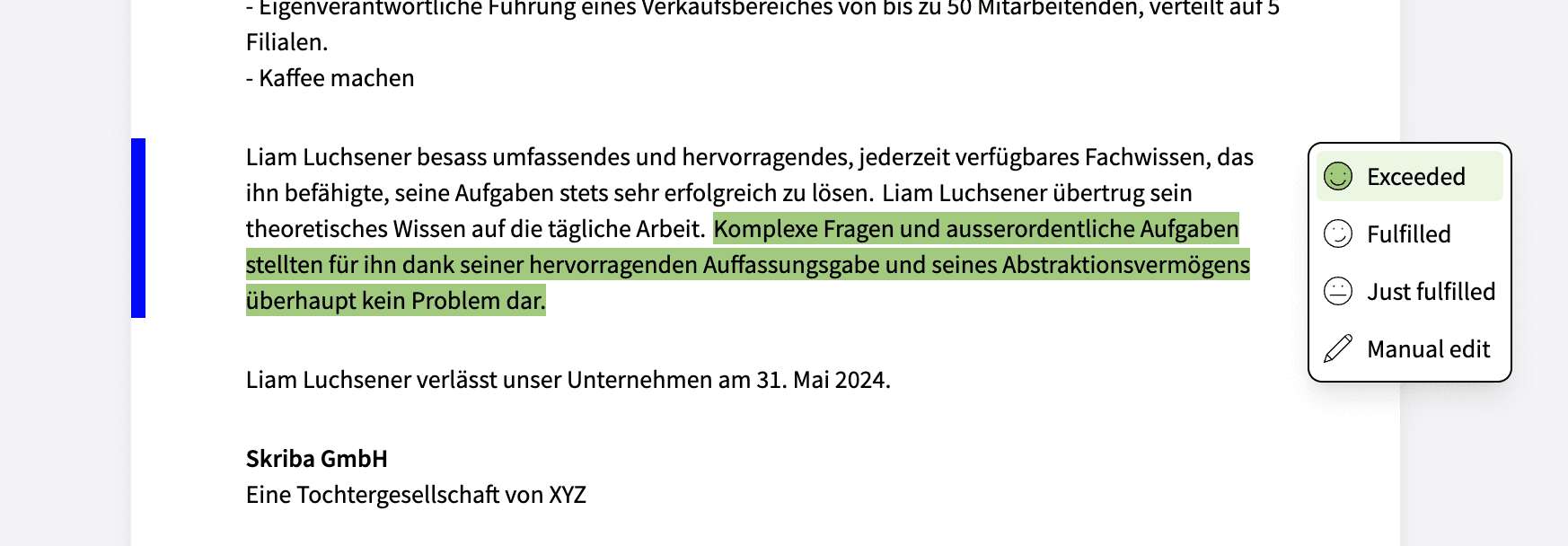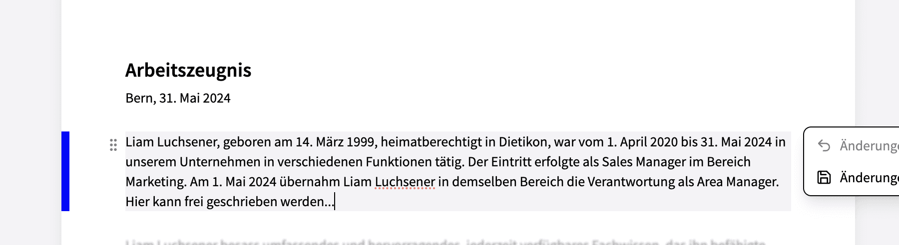 Manuel editieren war noch nie so einfach. Editieren Sie direkt auf dem Zeugnis in den jeweiligen Blöcken. Der KI-Assistent passt die Konjunktionen an, sobald Sie den Zeugnistyp ändern.
